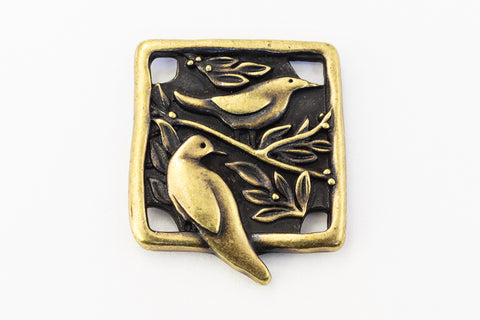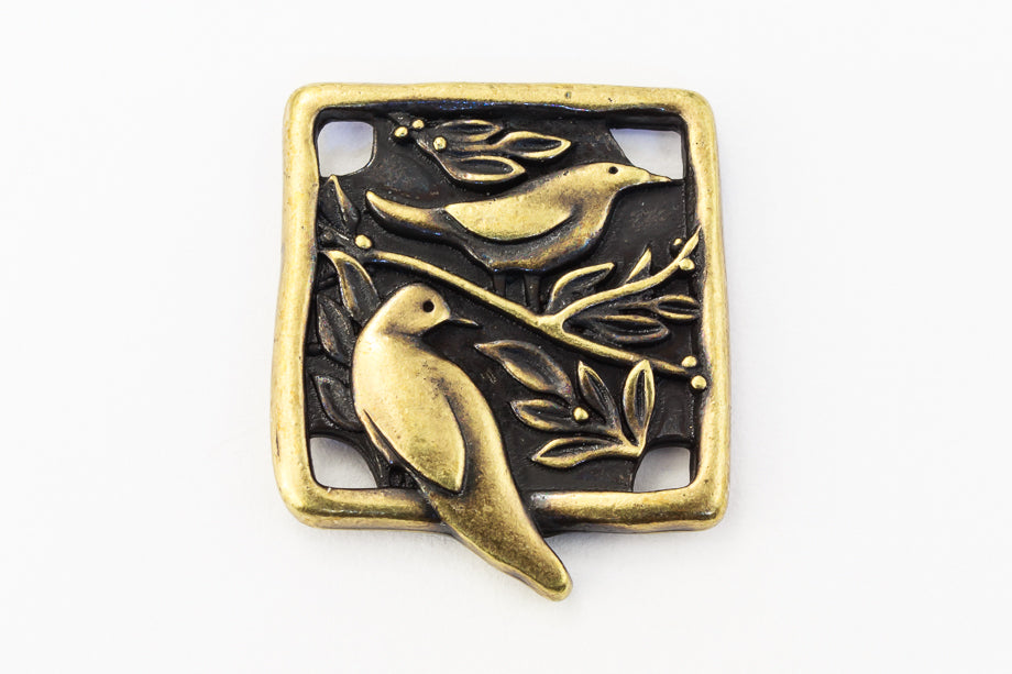 21mm x 18.5mm antique brass square link with detail of birds and leafy branches.