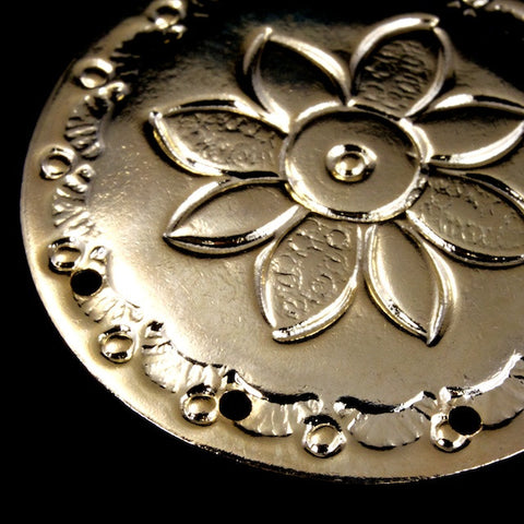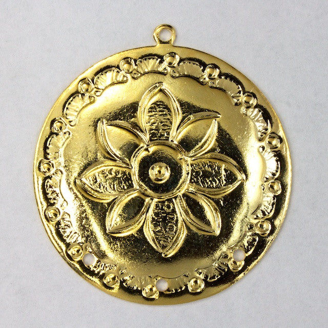 30mm gold plated circle with embossed southwest style daisy pattern.