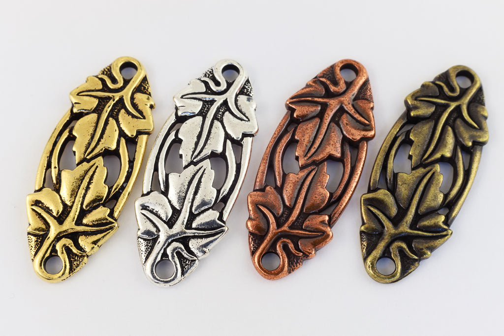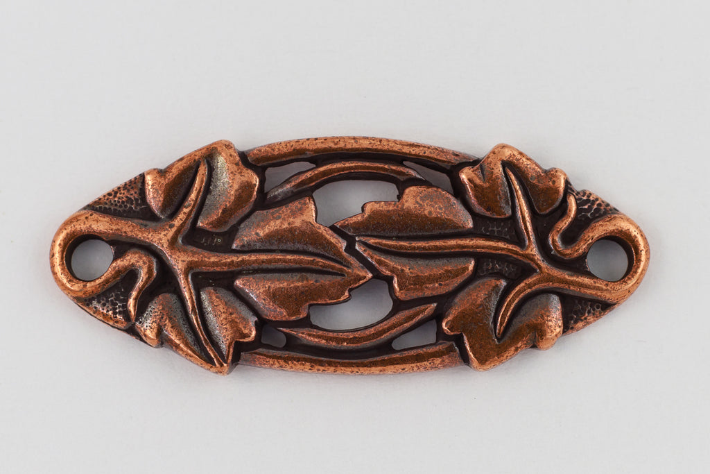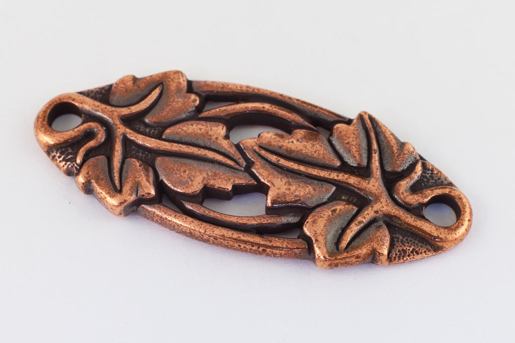 13.3mm x 33.4mm antique copper navette shape centerpiece with two sprays of leaves and 2.5mm hole at each end.