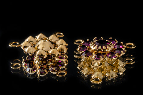 Amethyst Swarovski point back rhinestones sparkle in gold settings.