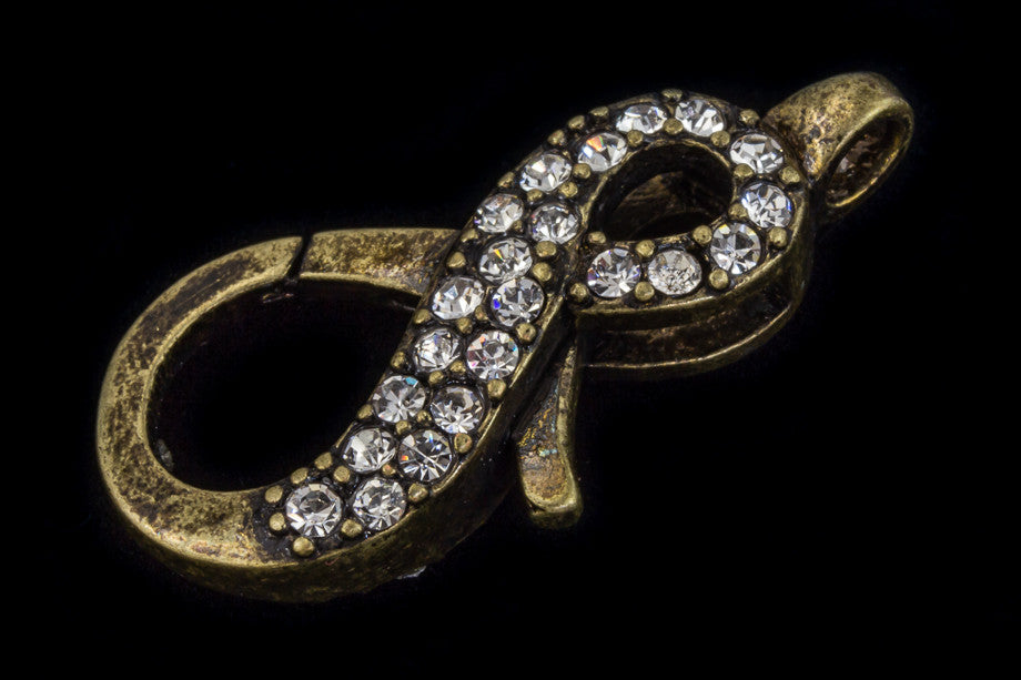 25mm x 11.5mm antique brass crystal lobster clasp shaped like infinity symbol.