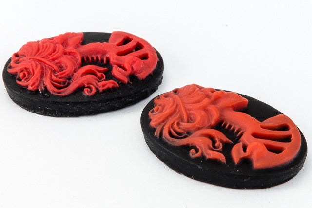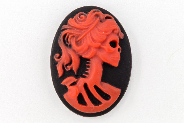 13mm x 18mm resin oval cameo with red detailed skeletal profile and black background.