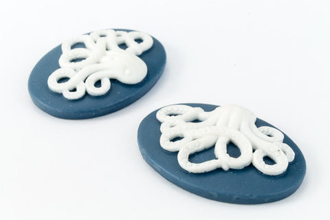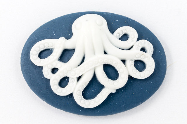 18mm x 25mm Lucite oval cameo with white detailed octopus and blue background.
