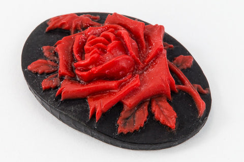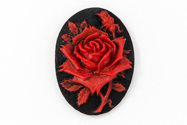 18mm x 25mm Lucite oval cameo with red detailed rose and black background.