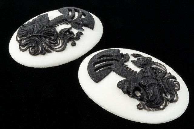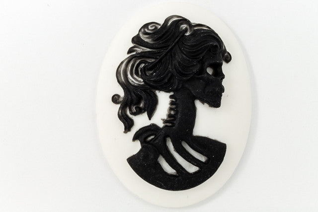 30mm x 40mm resin oval cameo with black detailed skeletal profile and white background.