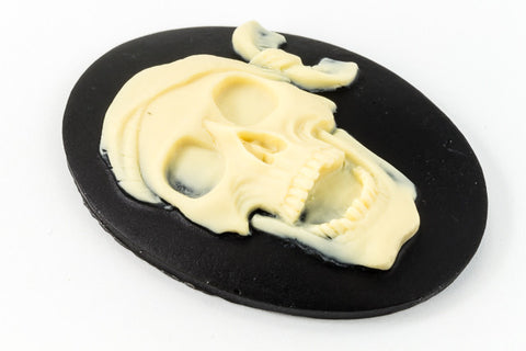 30mm x 40mm Lucite oval cameo with ivory detailed pirate skull and black background.