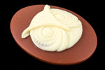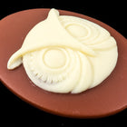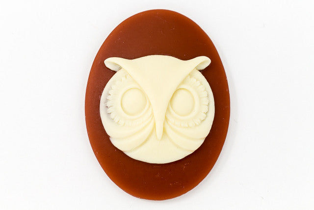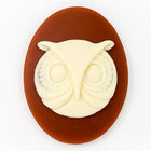 30mm x 40mm Lucite oval cameo with ivory stylized owl face and brown background.
