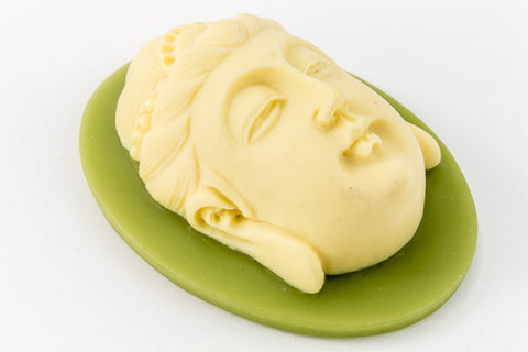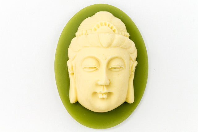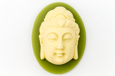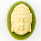 30mm x 40mm Lucite oval cameo with ivory detailed Buddha head and green background.