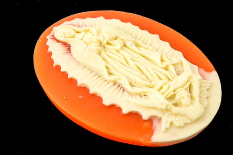 30mm x 40mm Lucite oval cameo with ivory detailed Virgin Mary and coral background.