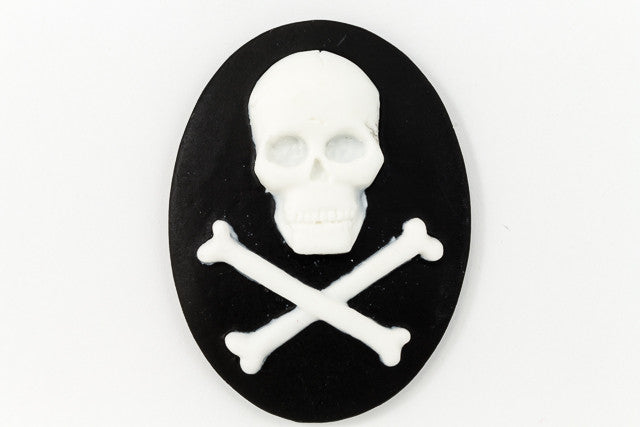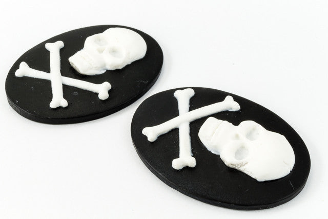 30mm x 40mm Lucite oval cameo with white detailed skull and crossbones and black background.