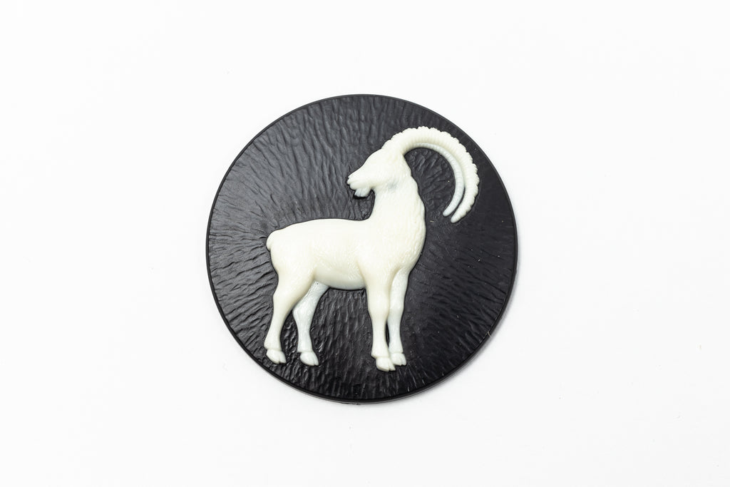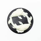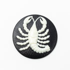 45mm round Lucite cameo with white detailed Scorpio symbol of a scorpion with raised tale and black background.