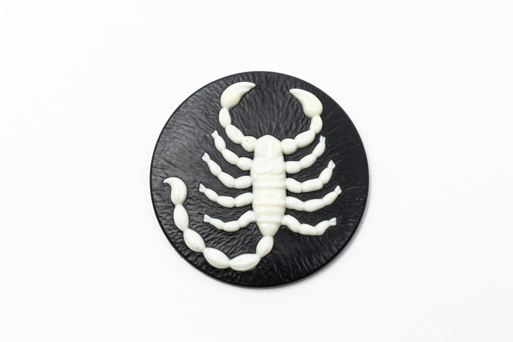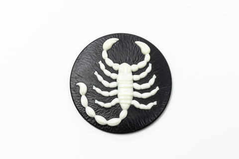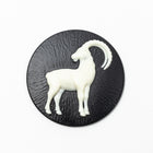 45mm round Lucite cameo with white detailed Virgo symbol of a seated maiden and black background.