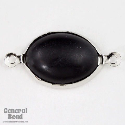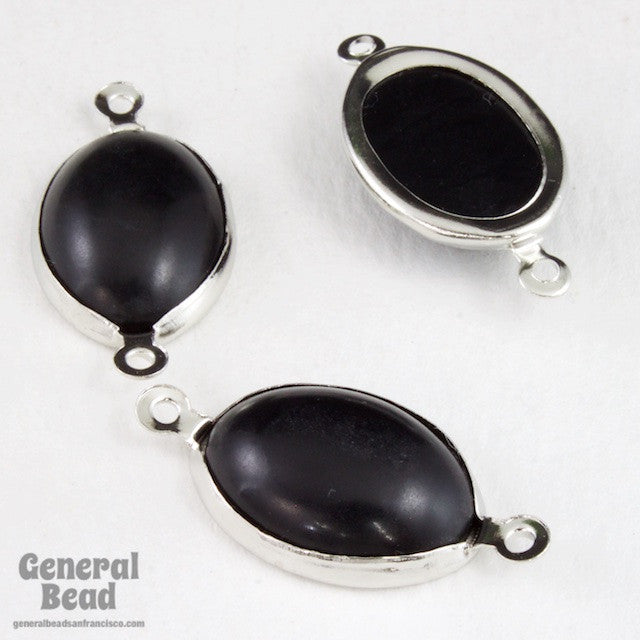 13mm x 18mm black oval cabochon with silver tone metal rim and loop on either side.