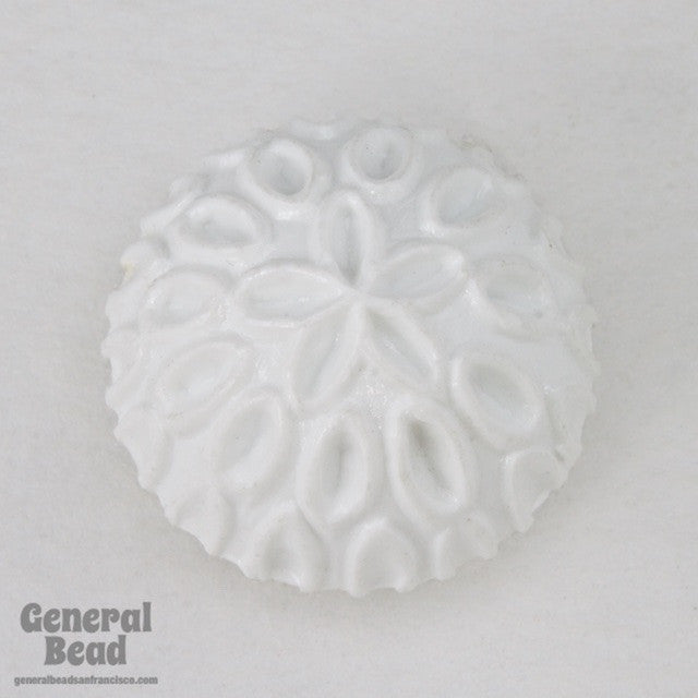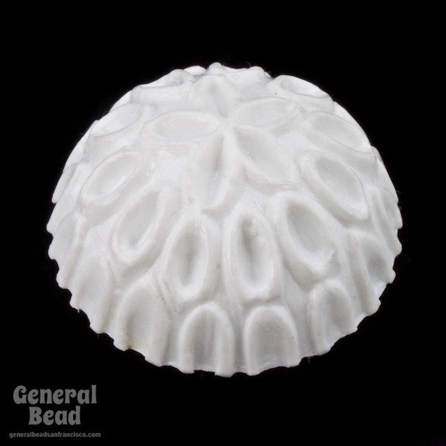 20mm opaque white high-domed flat back with dimensional floral pattern.