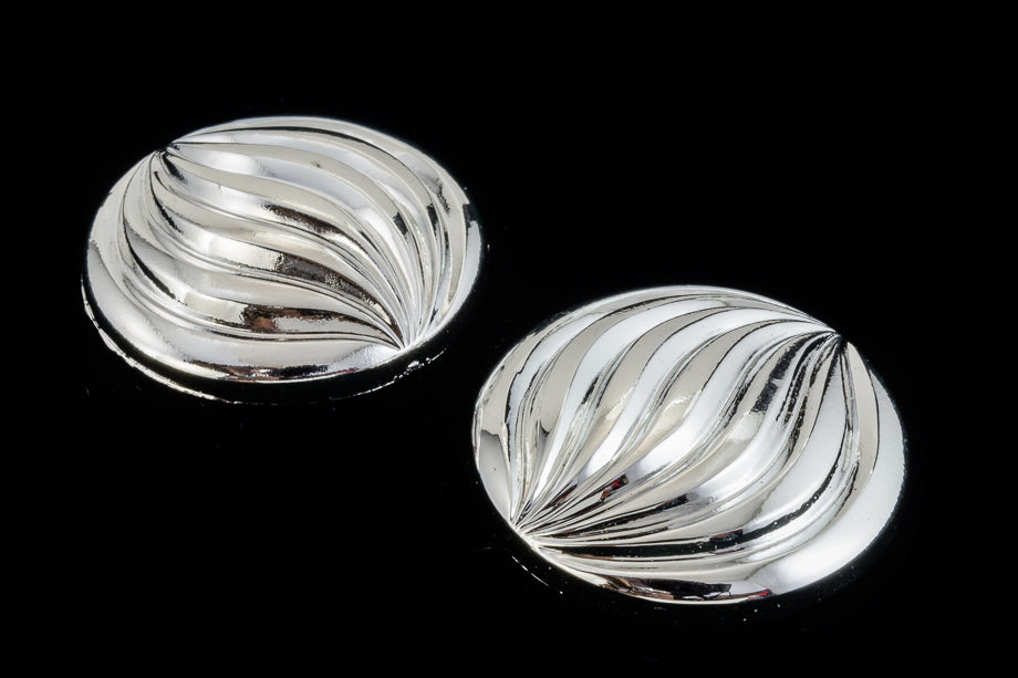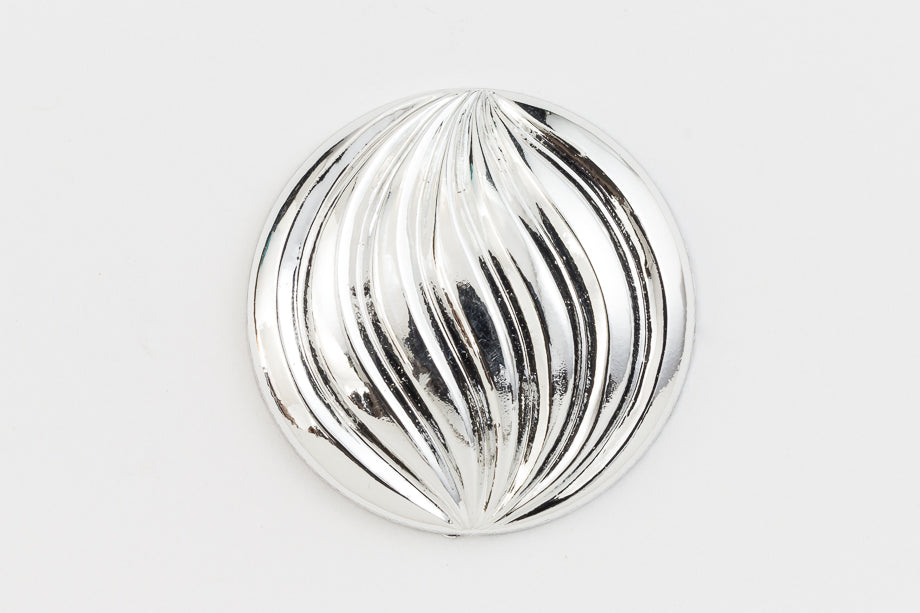 30mm metallic silver low dome round flat back with wavy ribbed surface.