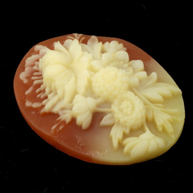30mm x 40mm light salmon and eggshell detail flower cameo. Flat back.