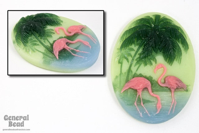 30mm x 40mm vintage Lucite cabochon with scene of flamingos and palm trees.