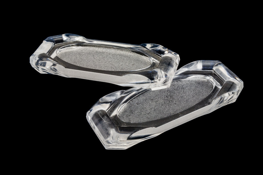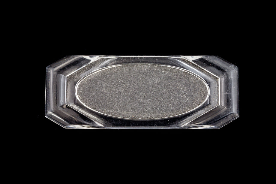 60mm x 22mm clear rectangular setting with beveled corners and 40mm x 16mm oval setting. Flat on back.