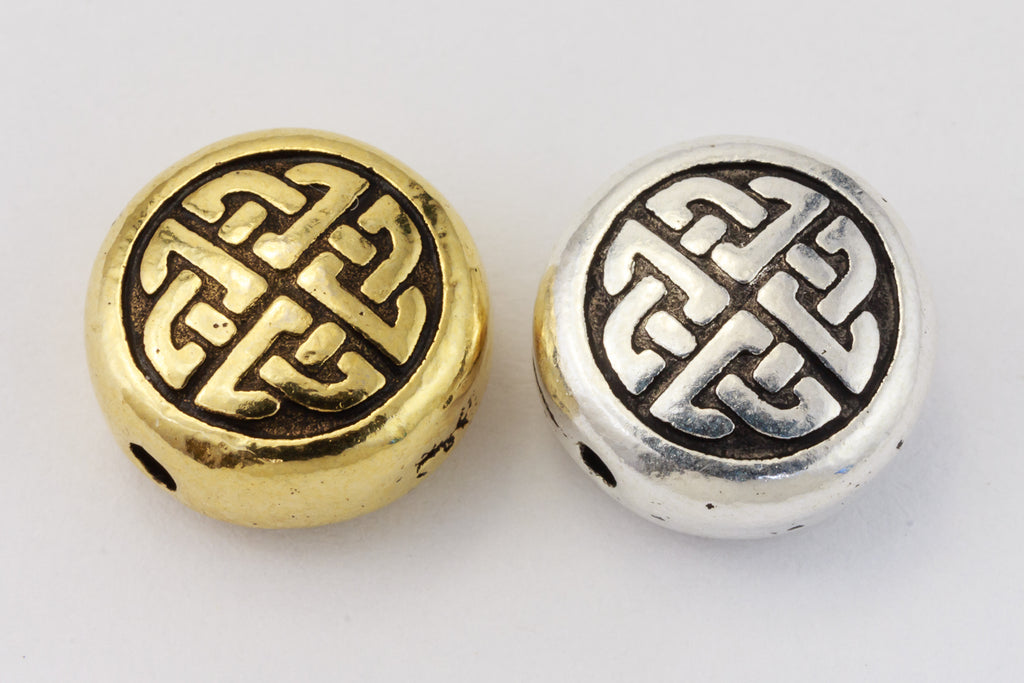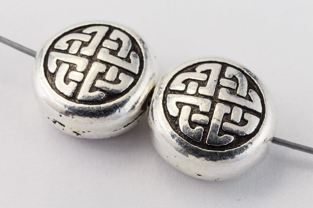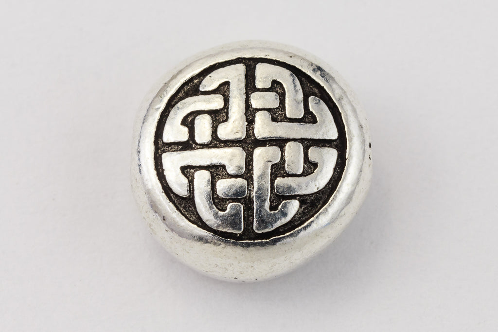 10mm x 10.25mm antique silver coin bead with intricate Celtic knot.