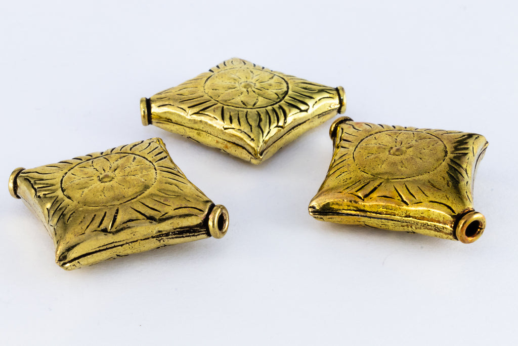 20mm antique brass square bead with embossed design and corner to corner hole.