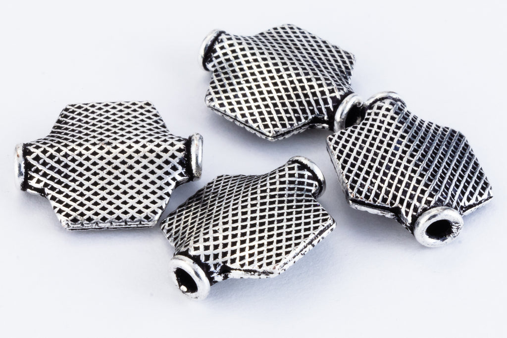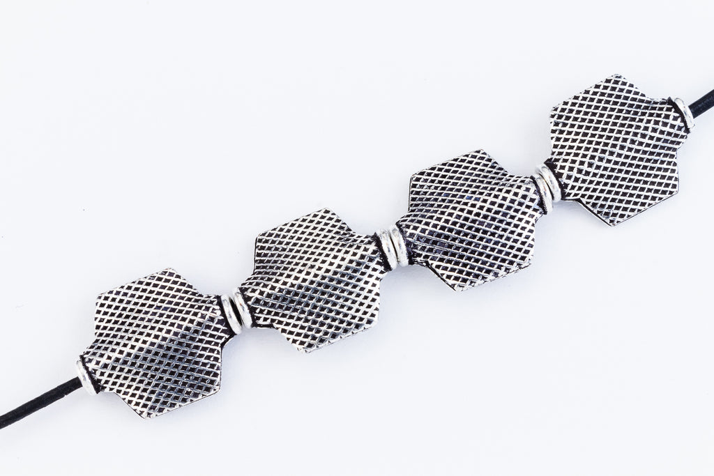 20mm antique silver flat hexagon bead with crosshatched texture and lengthwise hole.