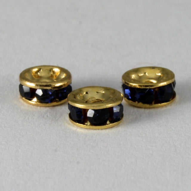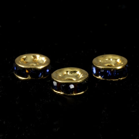 5mm x 2mm Swarovski encrusted rondelle bead with 1mm hole.Gold tone with Jet black rhinestones.Current manufacture in the USA using plated brass and Swarovski crystal.1, 12 or 144 pieces per package.