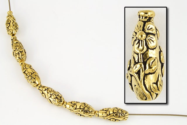 5mm x 15mm antique gold drop bead with wild rose decoration. Lengthwise 1mm hole.
