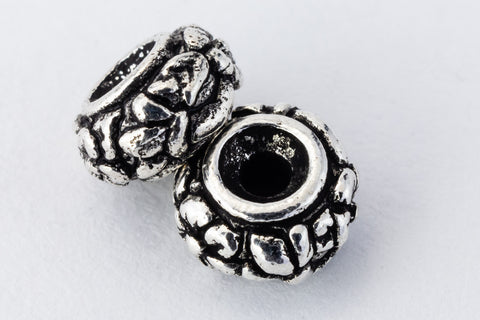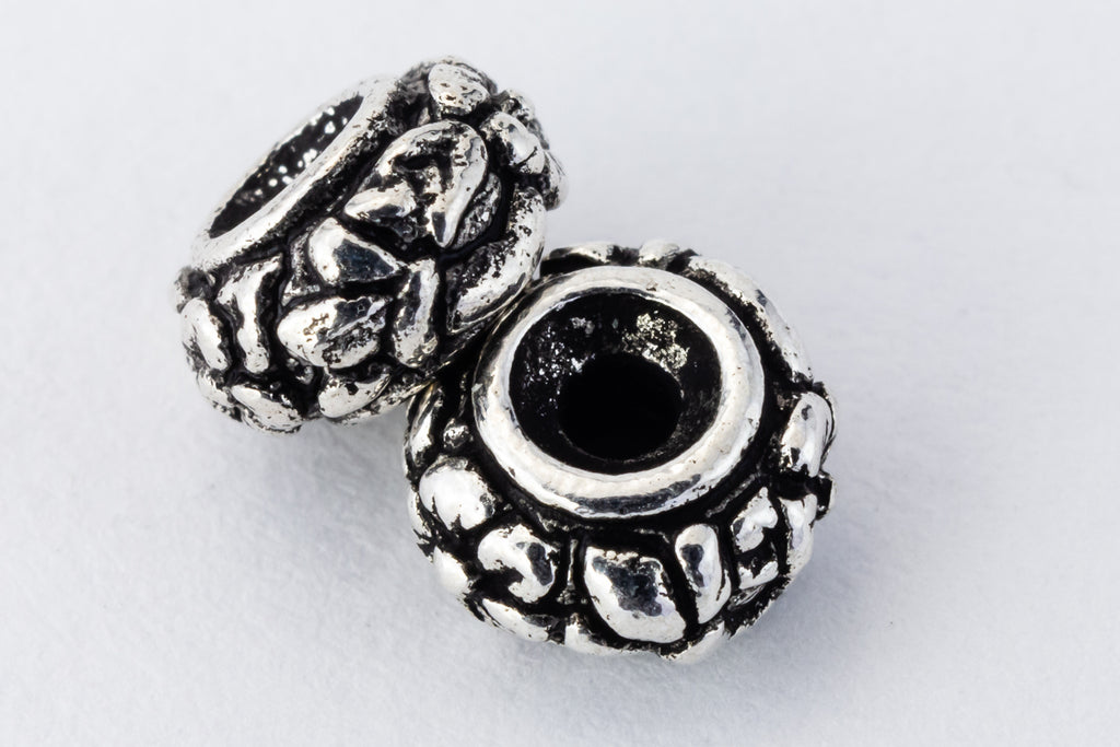 6.25mm x 3.5mm antique silver "Meadow" style bead with raised flowers and 1.25mm hole.
