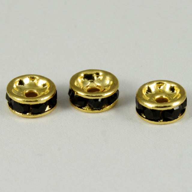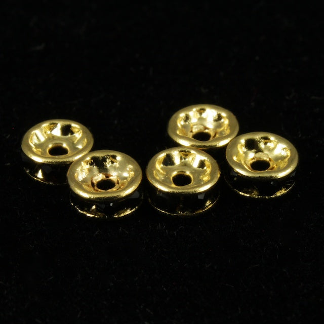 6mm x 2mm Swarovski encrusted rondelle bead with 1.5mm hole.Gold tone with Jet black rhinestones.Current manufacture in the USA using plated brass and Swarovski crystal.1, 12 or 144 pieces per package.