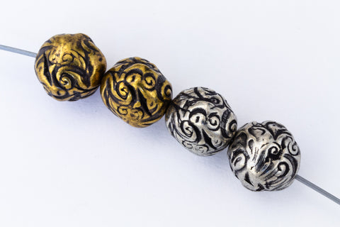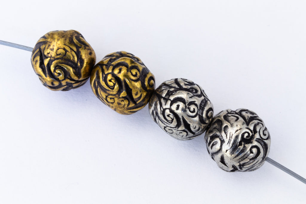 7.5mm x 8.6mm antique pewter "Jardin" style irregular round bead with raised floral scroll and 1.25mm hole.
