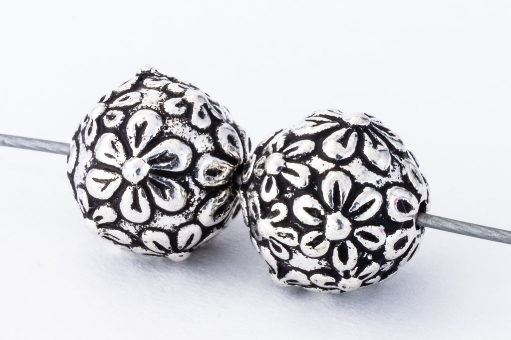 8mm antique silver round bead with raised flowers and 1mm hole.