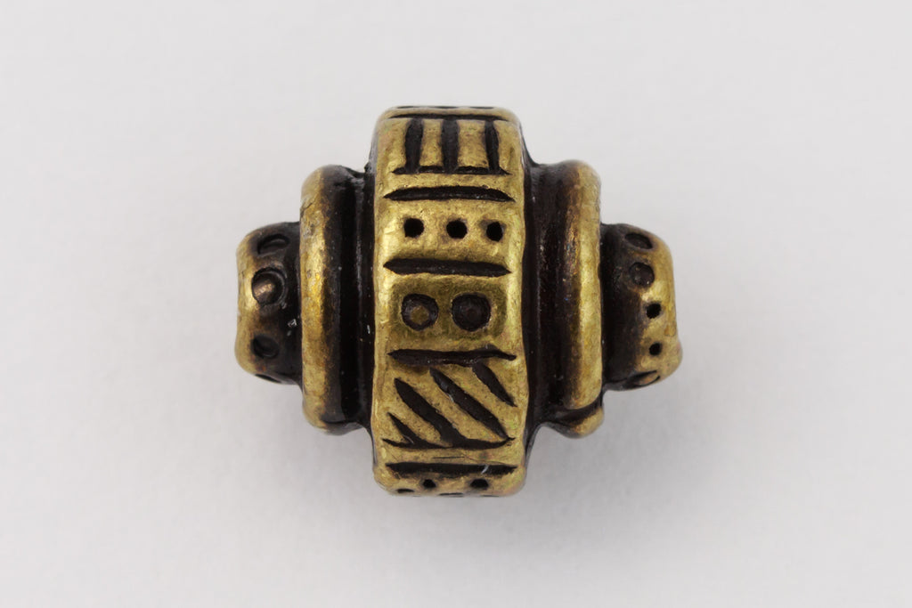 7.25mm x 9mm antique brass bead with geometric design and lengthwise 1.25mm hole.