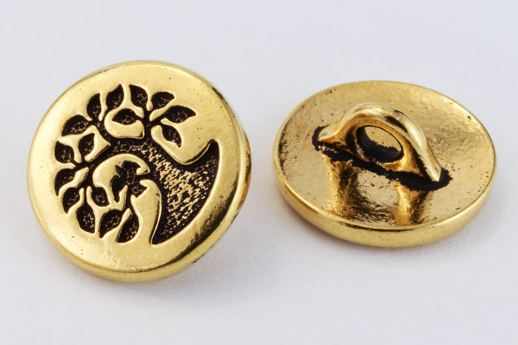 12.1mm antique gold round pewter button with embossed detail of a bird sitting in a tree.