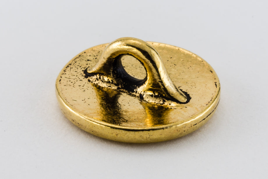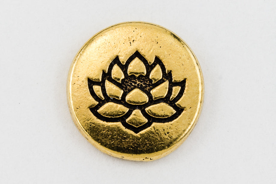 12mm antique gold round pewter button with engraved lotus blossom and 2.4mm shank on back.
