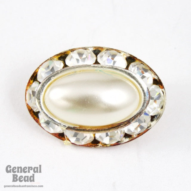 13mm x 18mm silver tone rhinestone button with 6mm x 12mm cultura faux pearl set in center and metal shank on back.