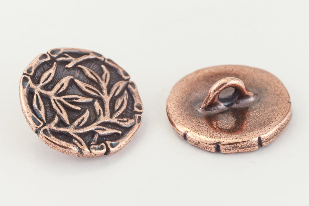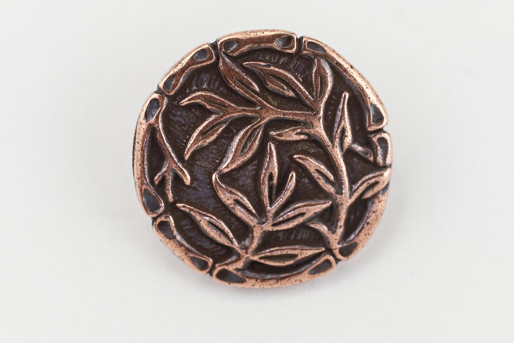 16mm antique copper round pewter button with raised bamboo design and 2.25mm shank on back.