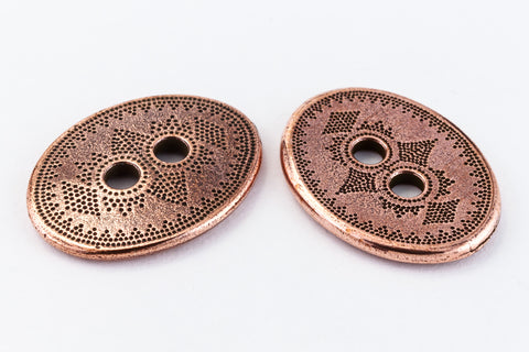 19mm x 14.75mm antique copper oval pewter button with geometric dot pattern and two 2.25mm holes.