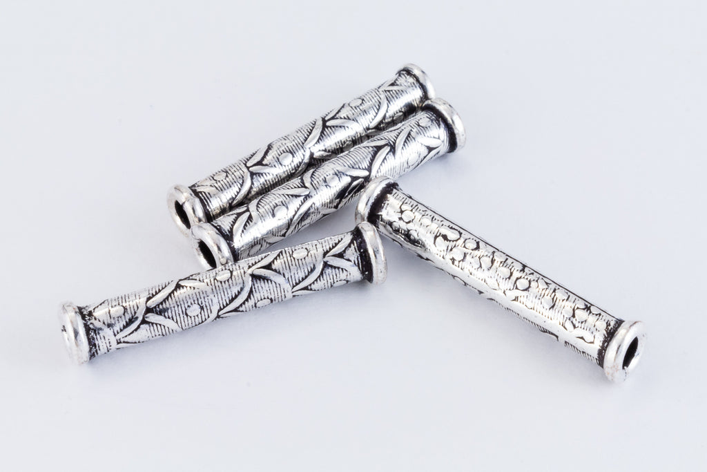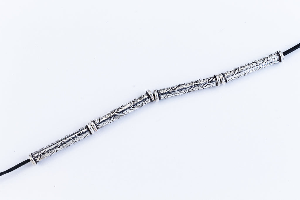 Antique silver 25mm x 4mm tube bead with layered scale and dot pattern.