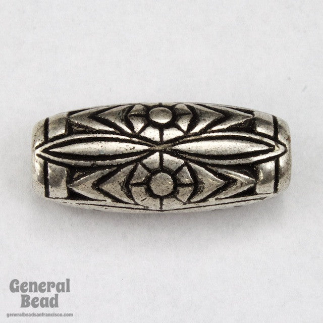 10mm x 25mm antique silver Lucite tube bead with floral design and lengthwise 4mm hole.