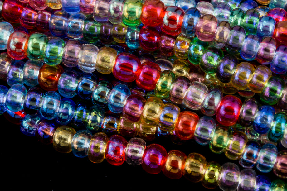 Size 8 multicolor mix of iridescent transparent seed beads.
