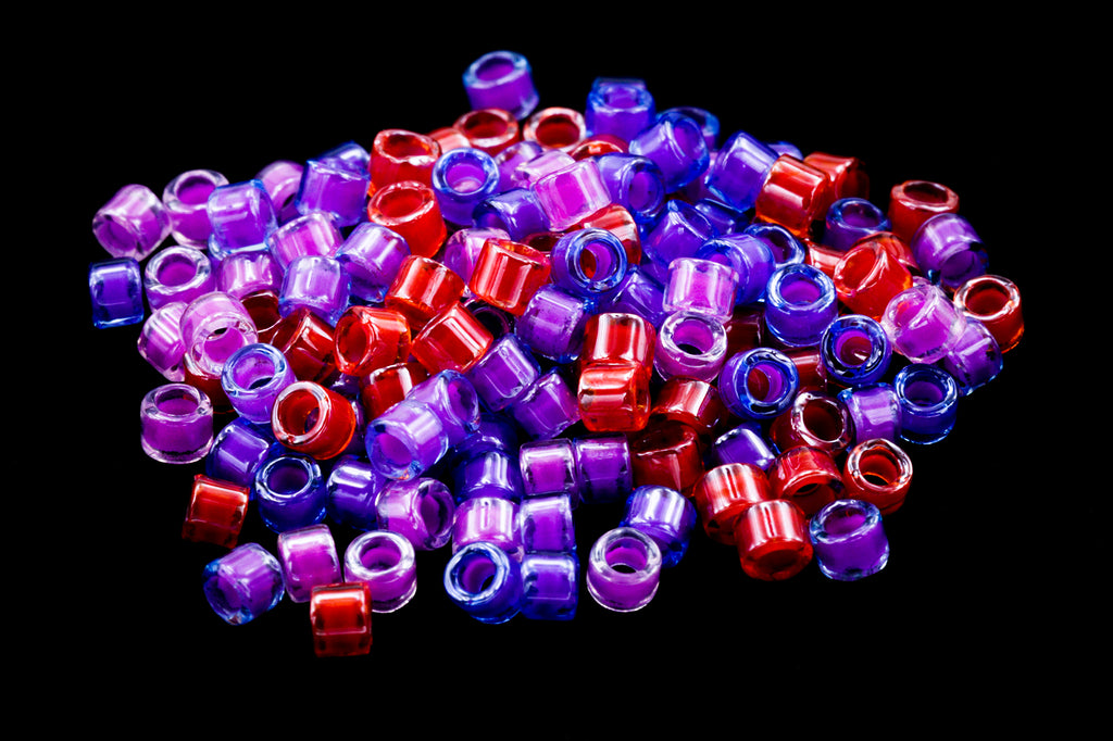 Size 11/0 mix of luminous purple, pink and red toned cylinder seed beads.
