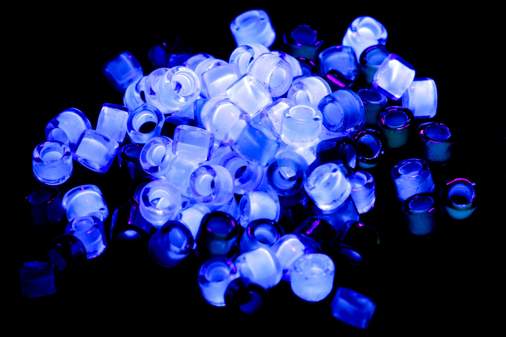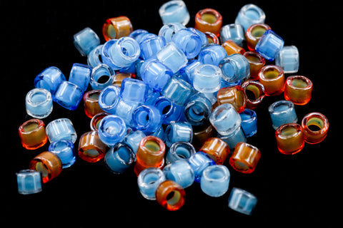 Size 11/0 mix of luminous blue and red toned cylinder seed beads.