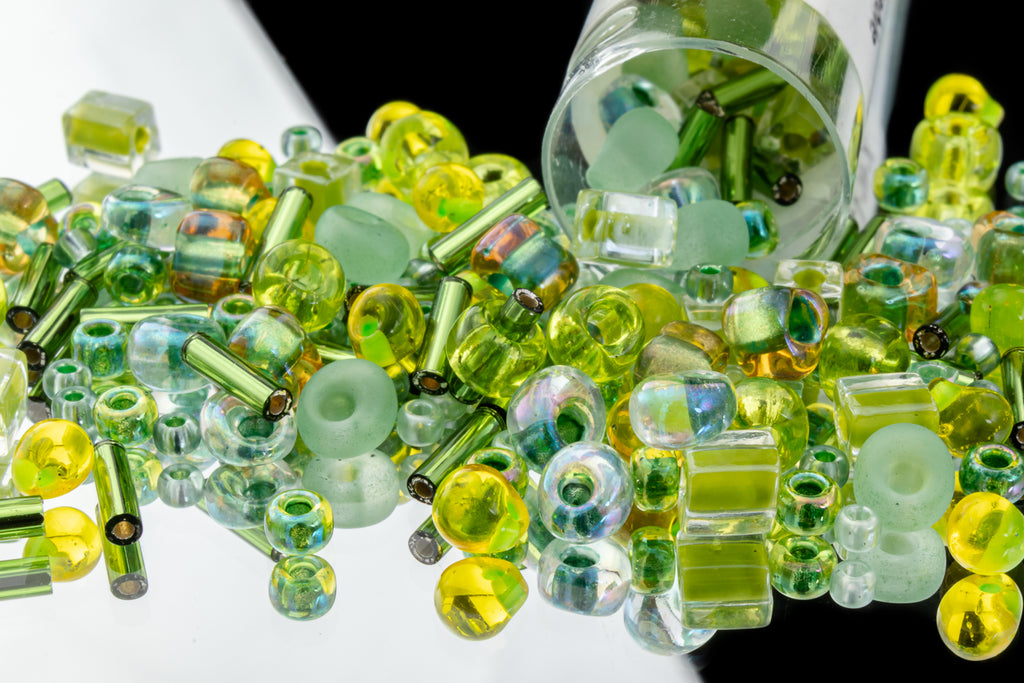 May include seed beads, bugles, cubes, hex beads and magatama drops.