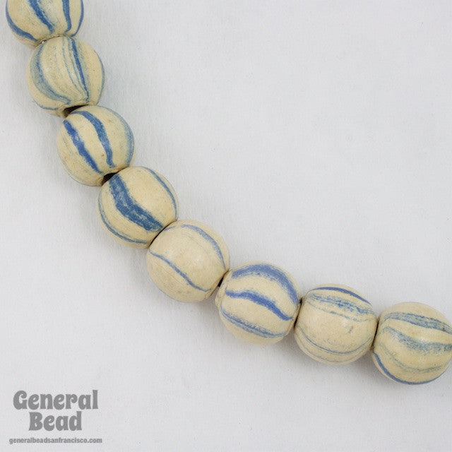 14mm handmade clay beads in cream with blue stripes.