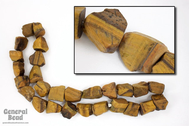 16 inch strand of unpolished rough cut tiger's eye chunks. Standard drilled hole through center.