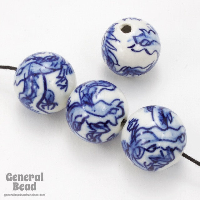 20mm white porcelain round bead with traditional Chinese blue dragon design.
