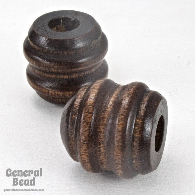 25mm x 25mm dark brown wood ribbed barrel bead with 8mm hole.