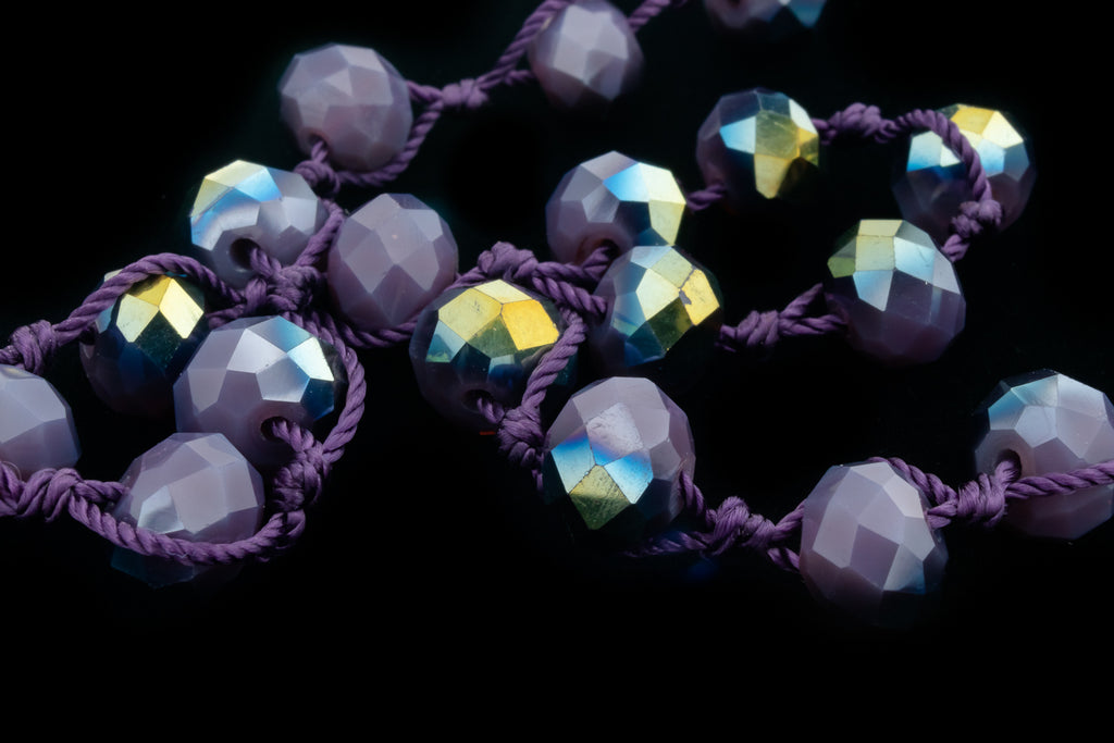 Opaque dark purple glass beads with iridescent finish on purple cord.
