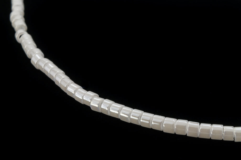 Size 11/0 opaque white pearl cylinder seed bead.