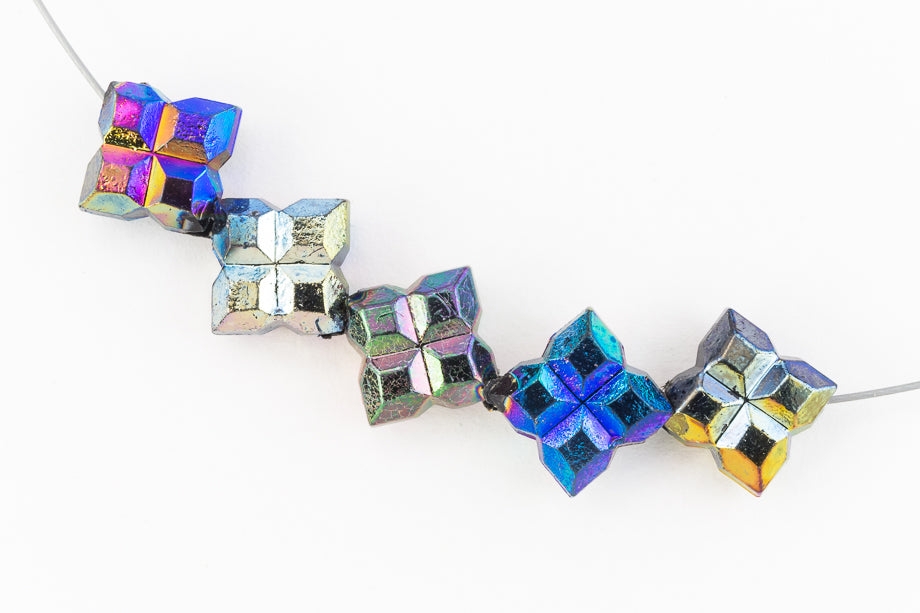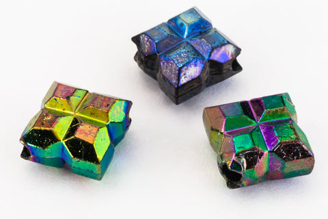 10mm iridescent jet square made of four faceted squares with diagonal hole through center.